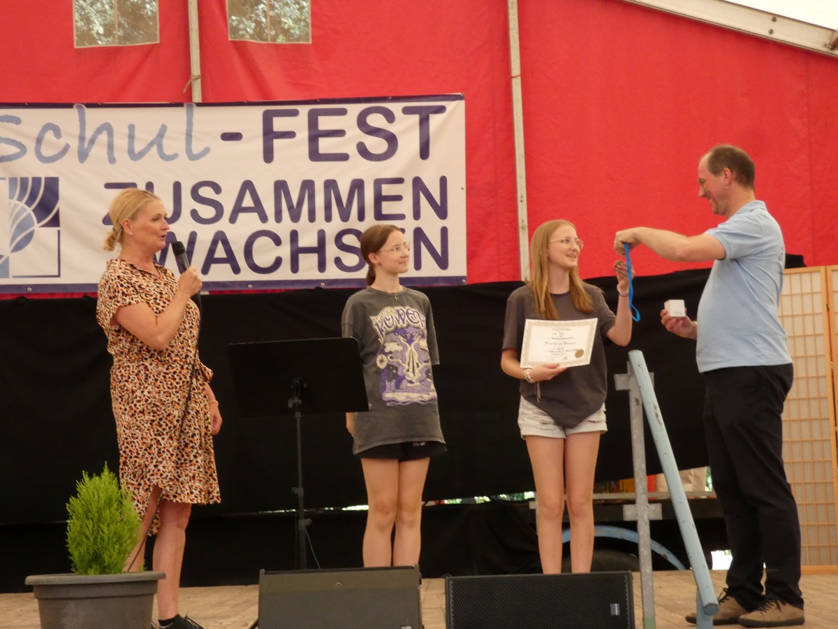 Alle Teilnehmenden erhielten tolle Sachpreise wie zum Beispiel eine Powerbank, englische Lektüren, Kalender, Trinkbecher und vieles mehr. Jahrgangssiegerin und gleichzeitig Schulsiegerin wurde Mia Vorast aus der 8c mit 316,25 von 350 zu erreichenden Punkten. Sie wurde mit einem Pokal und einer Sonderauszeichnung sowie mit dem Big Challenge Gewinnershirt belohnt. Noemi Penta aus der Klasse 7b setzte sich schulintern bei all denjenigen durch, die Englisch im 2. Lernjahr haben. Sie erreichte 311,75 Punkte und wurde mit einer Medaille und Ehrenurkunde geehrt.Ebenfalls eine Medaille und Urkunde erhielt Lina Ring aus der 8a, Siegerin in der Kategorie Englisch im dritten Lernjahr, mit 308,75 Punkten.