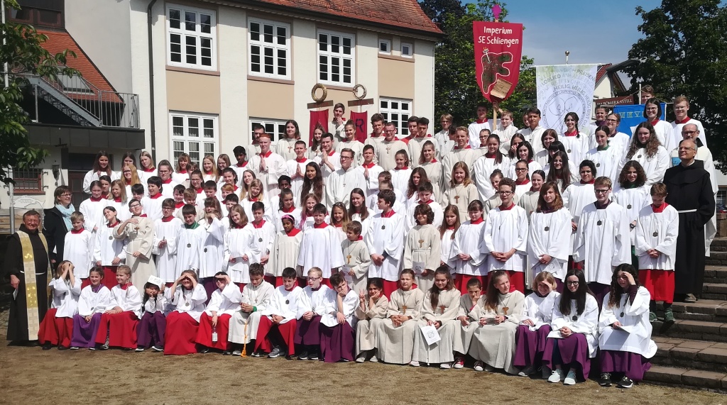 …hieß es auf der Einladung und so kamen sie. Insgesamt 150 aktive Ministranten und ihre Betreuer trafen sich vom 17. bis 19. Mai 2019 im Franziskanergymnasium Kreuzburg in Großkrotzenburg. Wer aber glaubte, die Einladung würde wie der berühmte Spruch des römischen Feldherren Caesar mit „vici“ weitergehen, sah sich getäuscht. Denn nicht Siegen steht für die Minis an erster Stelle, sondern Dienen, und so vervollständigte sich das Motto des Wochenendes zu: Veni – vidi – mini! Dass dabei die Grammatik der lateinischen Sprache nicht so genau genommen wurde, nahmen alle mit Humor.