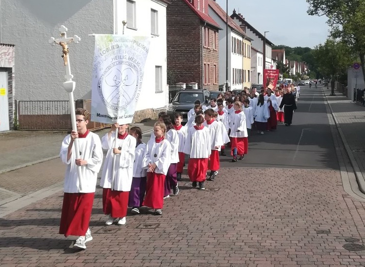Am nächsten Morgen schlüpften alle Minis in ihre mitgebrachten Gewänder und machten sich in einer Prozession auf den Weg in die Gemeindepfarrkirche St. Laurentius zum Abschlussgottesdienst. Bruder Michael dankte den anwesenden Ministranten, da sie mit ihrem Dienst den Gottesdienst bunt, jung und fröhlich gestalteten. Musikalisch begleitet von der Sakro-Pop-AG des Kreuzburggymnasiums ging es thematisch um wertvolle Begegnungen als Schätze des Lebens.