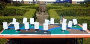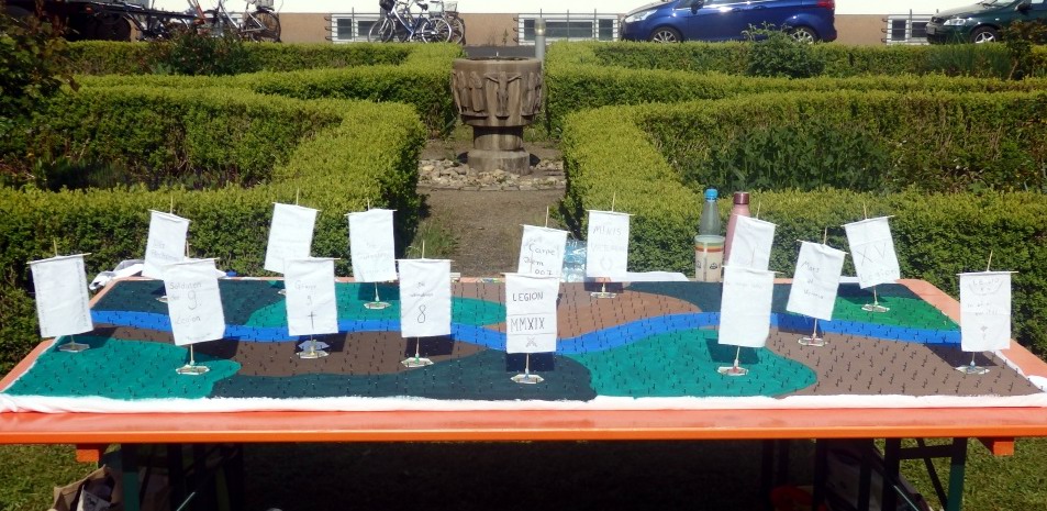 Angelehnt an das Spiel „Die Siedler von Catan“ sollten die Minis am zweiten Tag, in die Antike vor Christi gereist, ein Imperium wieder aufbauen. Insgesamt 15 Gruppen, altersgemischt und aus allen Gemeinden zusammengestellt, erspielten sich Rohstoffe, um auf einem überdimensionalen Spielbrett jeweils ihr Kastell und städtische Institutionen zu bauen und diese mit einem Limes zu sichern.