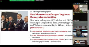 Der inhaltliche Input schloss mit der Frage, was im Koalitionsvertrag geregelt wird und was die drei Partner – SPD, Bündnis 90/Die Grünen und FDP – planen und welche Themen ganz oben auf der politischen Agenda stehen. Zum Abschluss hatten beide Kurse die Gelegenheit, gemeinsam zu diskutieren, inwiefern die Interessen der jungen Generation in der nächsten Amtszeit ausreichend politisch berücksichtigt werden. Dabei wurden auch konkrete Debatten aufgegriffen, wie etwa die Absenkung der Wahlalters auf 16 Jahre.