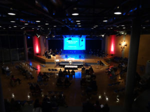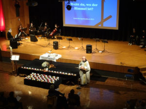 Über 60 Familien hatten im Vorfeld die Namen ihrer Verstorbenen genannt. So traf sich eine große Gruppe von Menschen am Abend des 7. November in der Aula. Die Technik-AG um Br. Bernardin hatte den Raum fast einen Tag lang eingerichtet. Die Schülerinnen der Sakro-Pop-AG um Andreas Heindel und einige Kolleginnen und Kollegen begleiteten die Feier mit Gesang und ihren Instrumenten. Br. Michael ging den Gedanken zum Himmel mit Hilfe biblischer Texte und einem Bilderbuch um die Hummel Bommel nach.