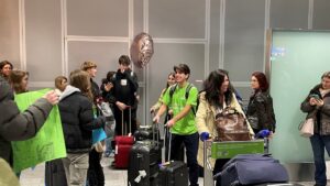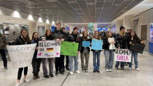 der Tag, auf den wir schon so lange gewartet hatten! Bislang kannten wir unsere Austauschpartner:innen nur über ihren Vorstellungsbrief und per Chat oder Videotalk – nun sollten wir uns das erste Mal begegnen! Um 10.15 Uhr trafen wir 11 deutschen Austauschteilnehmer:innen, Frau Bröckers und unsere Eltern im Terminal 1 des Frankfurter Flughafens ein. Davor hatten wir unseren Austauschpartnern einen guten Flug (12 Stunden Direktflug) gewünscht und während des Fluges natürlich die ganze Zeit über Flight Radar beobachtet, wo sie denn so waren. Mit 2-stündiger Verspätung landeten sie – und wir Deutschen warteten schon gespannt am Gate. Jeder hatte ein Plakat gebastelt und stand schon für die herzliche Begrüßung parat.