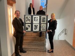 Pandemiebedingt fand die Ausstellungseröffnung im kleinen Rahmen mit Vertreterinnen und Vertretern des Staatlichen Schulamtes (Amtsleiterin Sonja Litzenberger, Anne Schadt-Wintermeyer als Verantwortliche für Kulturelle Bildung) und des Franziskanergymnasiums Kreuzburg (Schulleiter Thomas Wolf, Fachbereichsleiterin Yvonne Wallisch, Fachsprecher Kunst Nicolai Vogt) statt.