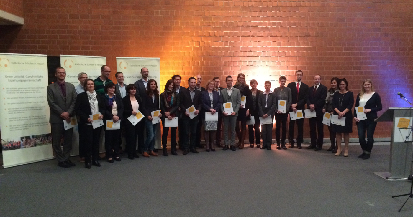 Den Absolventen des vom Pädagogischen Zentrum der Bistümer im Lande Hessen angebotenen Führungskollegs wurde am 9. November 2015 ein Zertifikat für den erfolgreichen Abschluss überreicht. Mit dabei waren von unserer Schule die päd. Leiterin Andrea Dähn, die Stufenleiterin 7/8 Yvonne Wallisch und der Studienleiter Thomas Schreiber.Bei dem Führungskolleg handelt es sich um eine zeitgemäße und zertifizierte Weiterbildung für Führungskräfte an Katholischen Schulen. In sieben Modulen wurden innerhalb eines Jahres alle Themenbereiche, die für eine Schulleitung wichtig und interessant sind, behandelt. Unter dem Motto „Schule leiten – Vielfalt gestalten – Leben wecken“ ging es insbesondere um die Verantwortung für Unterrichtsentwicklung, ein solides Qualitätsmanagement und die Initiierung von Entwicklungsprozessen.