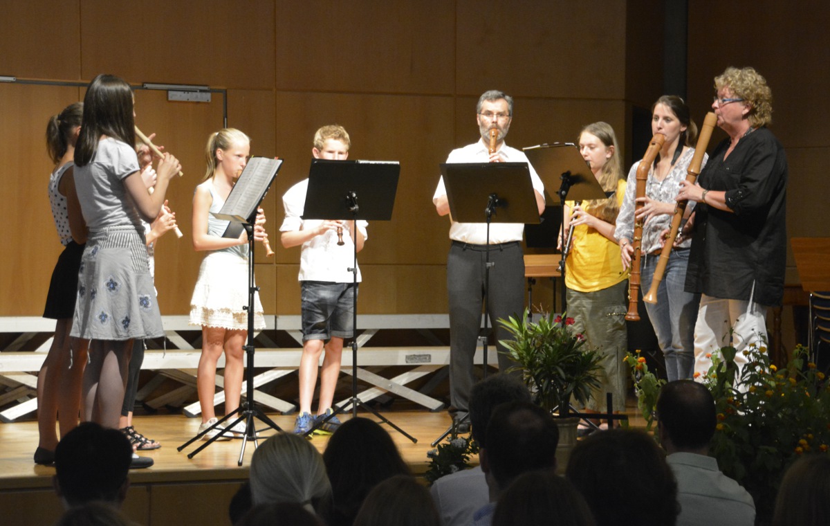 Das Blockflötenensemble“, unter der Leitung von Maria Fuest, brachte neben zwei Tänzen in diesem Jahr eine Uraufführung zu Gehör. Musiklehrer Andreas Heindel hatte für diese Musikgruppe ein Blöckflötenquartett komponiert, aus welchem der 1. Satz – Allegro scherzando – gespielt wurde. Die anspruchsvolle Komposition wurde ebenso anspruchsvoll umgesetzt und erhielt großen Beifall.