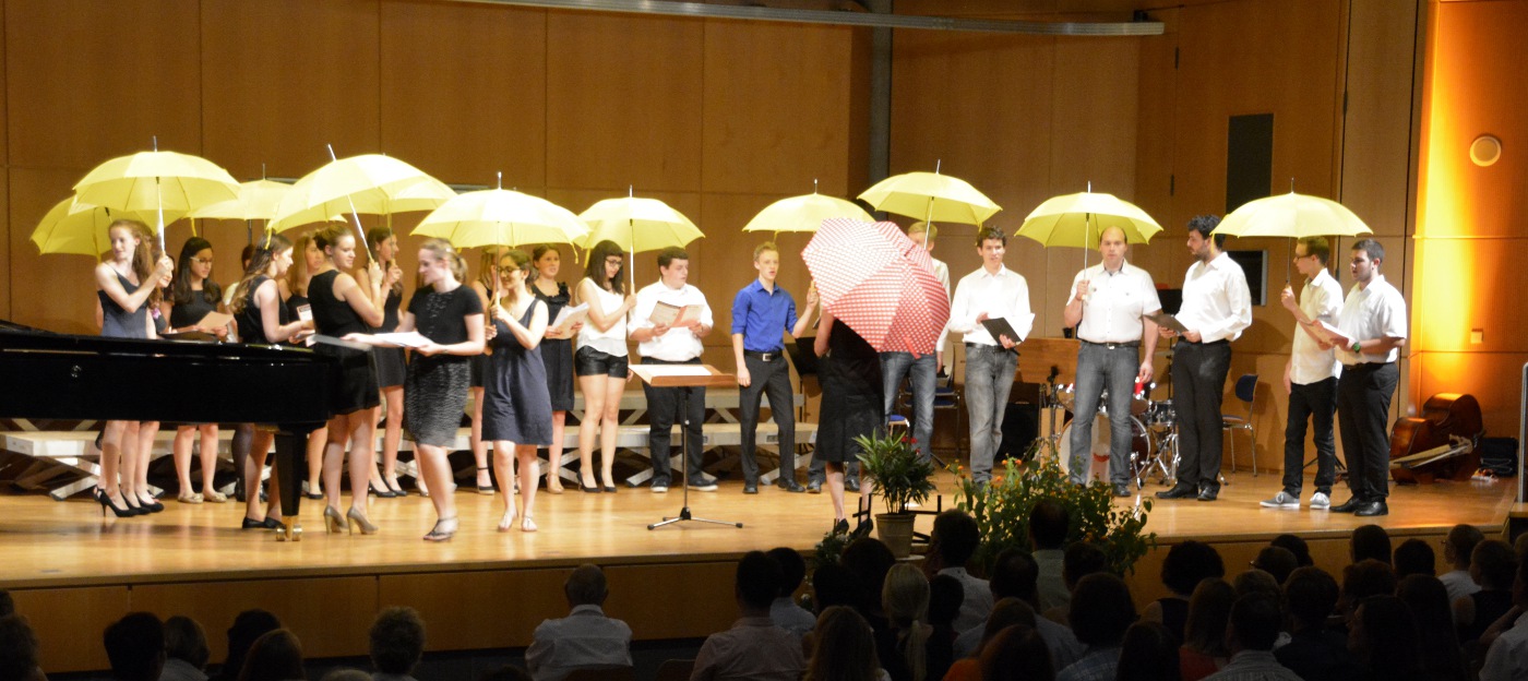 Publikumswirksam war nun der Auftritt des „Kammerchores“. Mit geöffnetem Regenschirm erwartete die Leiterin Dr. Maria-E. Heisler-Wiegelmann ihren Chor, der allmählich – ebenso mit geöffneten Schirmen – die Bühne, tänzelnd und singend zum einleitenden Ostinato des Songs „Singin´ in the rain“ betrat und diesen klanglich schön dann in einer Chorfassung zu Gehör brachte.