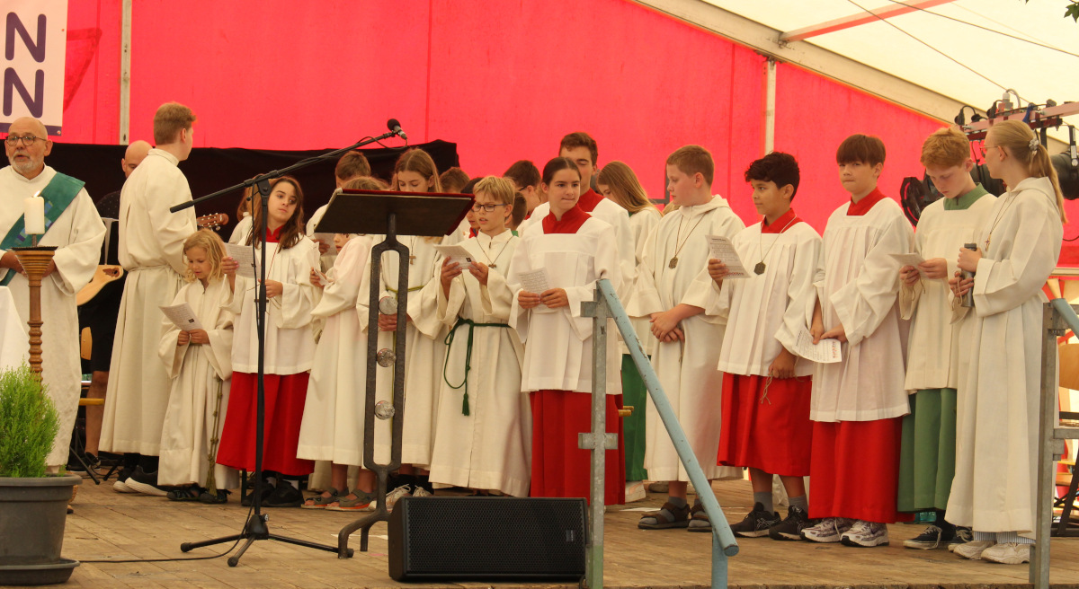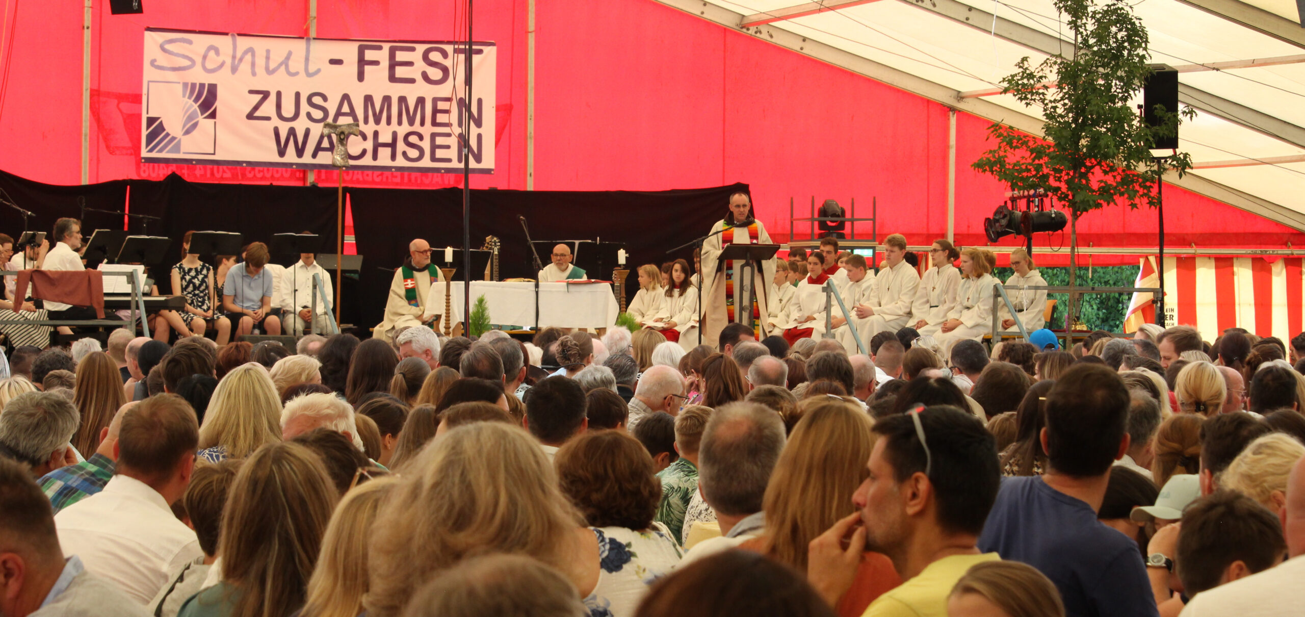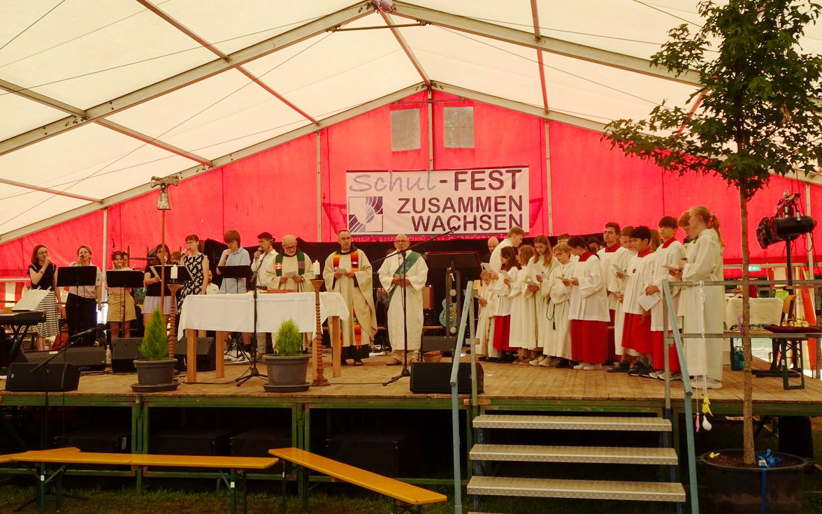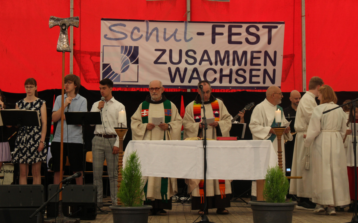 Bevor die Zelebranten die Gäste zum Schulfest entließen, verteilten sie noch den Segen von der Festzeltbühne, damit dieser weitergetragen werden kann. Sie bedankten sich bei den vielen Menschen, die zum Gelingen des Gottesdienstes beigetragen hatten, unter anderem auch den zahlreichen Messdienern, die normalerweise in den umliegenden Gemeinden eingesetzt sind, aber zu diesem Anlass hierhergekommen waren.