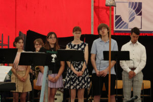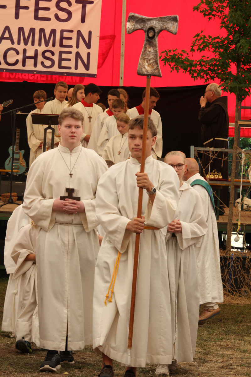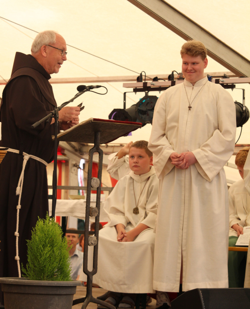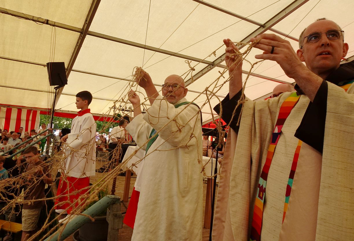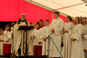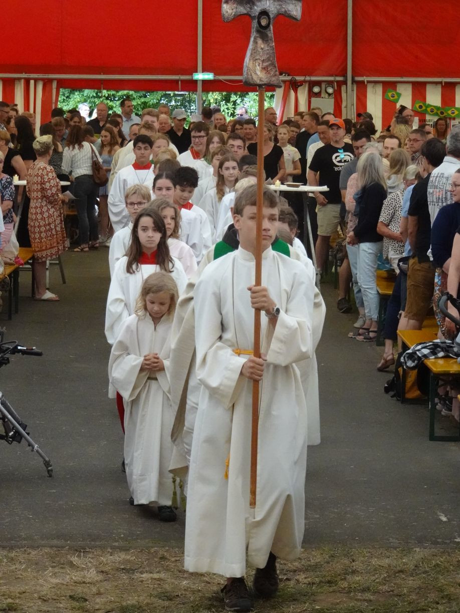 Bevor die Zelebranten die Gäste zum Schulfest entließen, verteilten sie noch den Segen von der Festzeltbühne, damit dieser weitergetragen werden kann. Sie bedankten sich bei den vielen Menschen, die zum Gelingen des Gottesdienstes beigetragen hatten, unter anderem auch den zahlreichen Messdienern, die normalerweise in den umliegenden Gemeinden eingesetzt sind, aber zu diesem Anlass hierhergekommen waren.