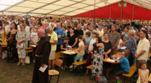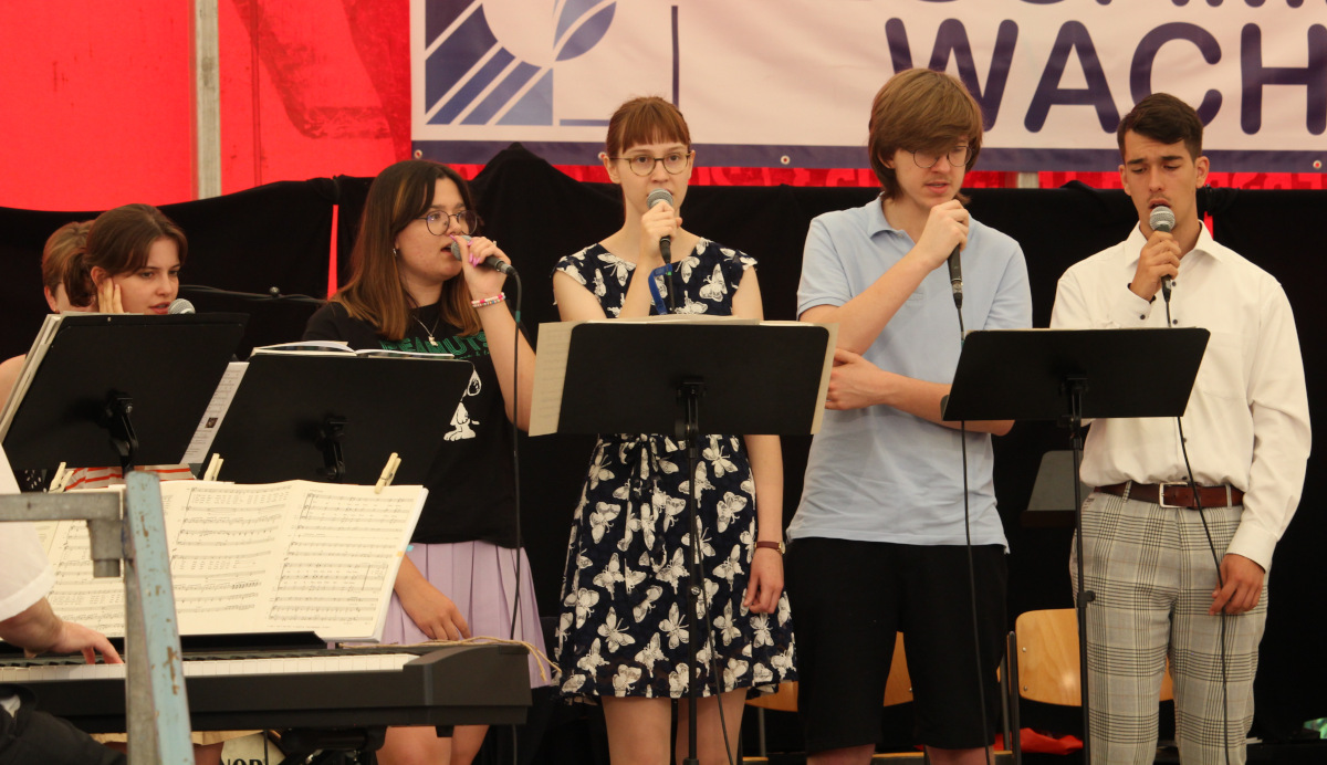 „Eingeladen zum Fest des Glaubens“ begrüßte die Sacro-Pop-AG mit ihrem Lied alle Besucherinnen und Besucher des Gottesdienstes im vollen Festzelt für 2.000 Personen, das auf dem Bolzplatz des Franziskanergymnasiums Kreuzburg aufgebaut wurde. Die Schule hatte nicht nur zum Gottesdienst eingeladen, sondern zu einem viertägigen Fest mit unterschiedlichsten Schwerpunkten.