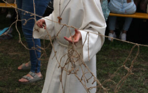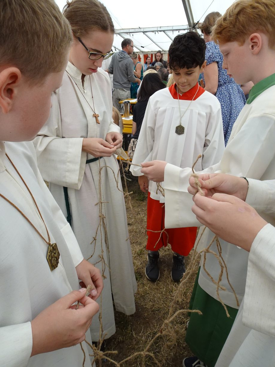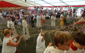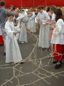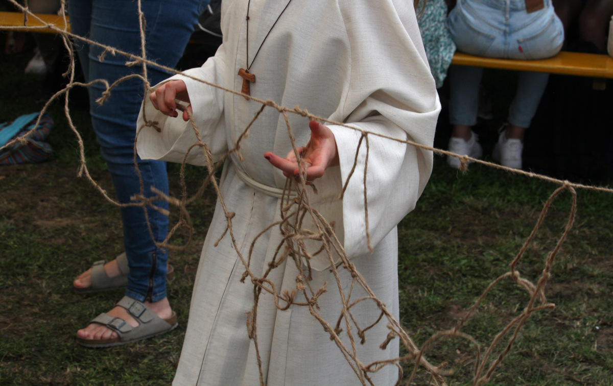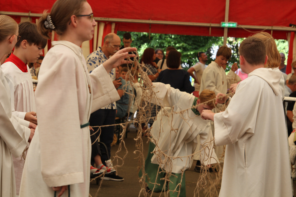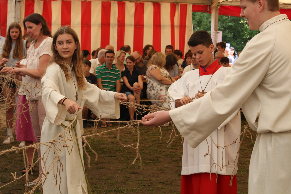 „ZusammenWachsen“ war das große Thema des Schulfestes und darum ging es auch in der Lesung des Gottesdienstes: In der Geschichte machten mehrere ältere, große Bäume einem kleinen Kirschbaum, der nicht genug Licht bekam, Platz, damit auch er wachsen konnte. Bruder Markus Fuhrmann ofm, der Provinzialminister der deutschen Franziskaner, der zum Schulfest angereist war, gab in seiner Predigt weitere Tipps zum Zusammenwachsen. Er verwies dabei auf die erforderliche Liebe, die auch schon im lateinischen Theater am Vortag von den Schülerinnen und Schülern besungen wurde. Symbolisch knüpften die Gottesdienstbesucherinnen und -besucher aus kleinen Seilknoten, die zuvor verteilt worden waren, ein großes Netz. Dieses wurde um einen Amberbaum an der Bühne gelegt. Dieser Laubbaum begleitete an diesem Ort das gesamte Schulfest und soll danach als Erinnerung auf dem Schulgelände weiterwachsen.